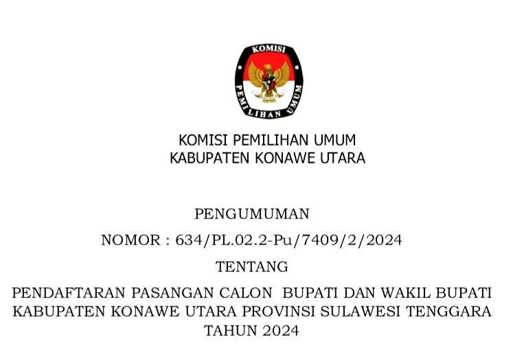 Penguguman tersebut tertuang dalam Nomor : 634/PL.02.2-Pu/7409/2/2024, tentang pendaftaran pasangan Calon Bupati dan Wakil Bupati Kabupaten Konawe Utara, Provinsi Sulawesi Tenggara.