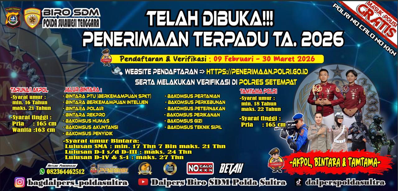 NARASISULTRA.ID, KONUT- Kepolisian Negara Republik Indonesia melalui Biro SDM Polda Sulawesi Tenggara resmi membuka Penerimaan Terpadu Polri Tahun Anggaran 2026. Pendaftaran dan proses verifikasi administrasi berlangsung mulai 9 Februari hingga 30 Maret 2026.